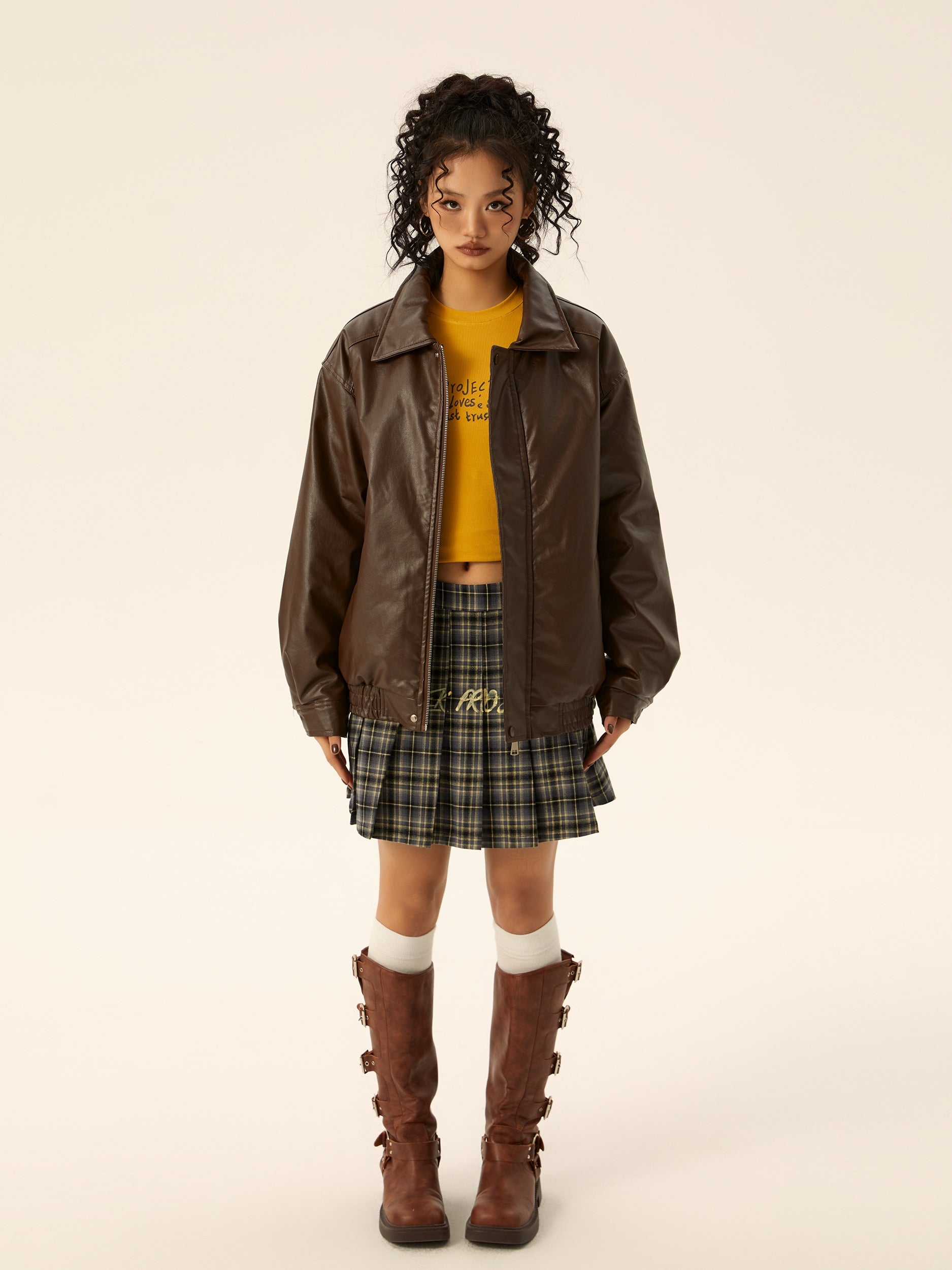 Stylish Design: Brown motorcycle leather jacket with a trendy American retro look.