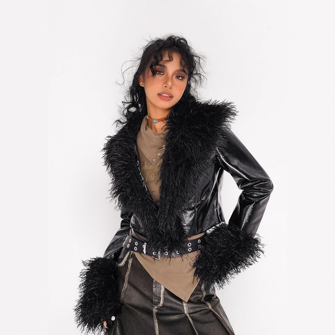 Stylish Design: Black glossy PU leather jacket with retro fur collar, perfect for creating a trendy street fashion look.